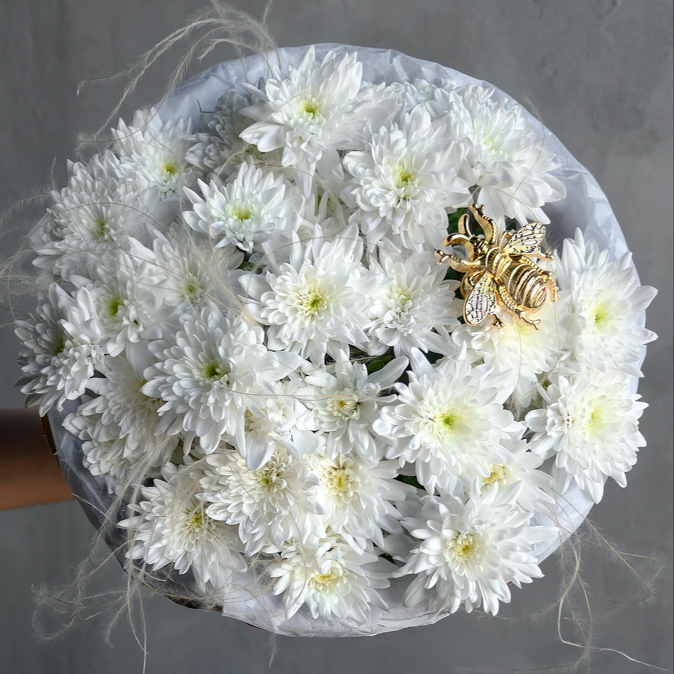 Белый креативный букет с золотым жуком из хризантем