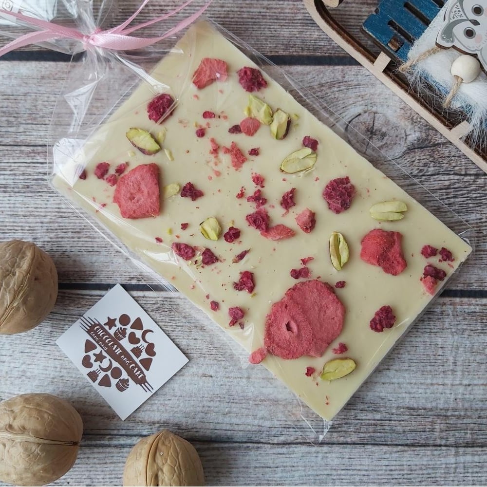 Белый шоколад ручной работы с сердечками (начинка: фисташка и сублимированная клубника).