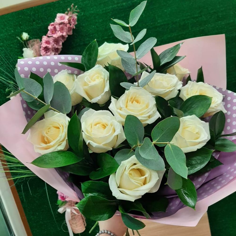 Белые розы с ароматным эвкалиптом и изумрудным рускусом.