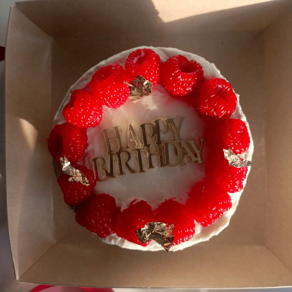 Начинка сникерс Размер бенто S 10 см в диаметре Высота 5 см Венок мармеладный выполнен из малинового пюре Украшен золотыми листами съедобными