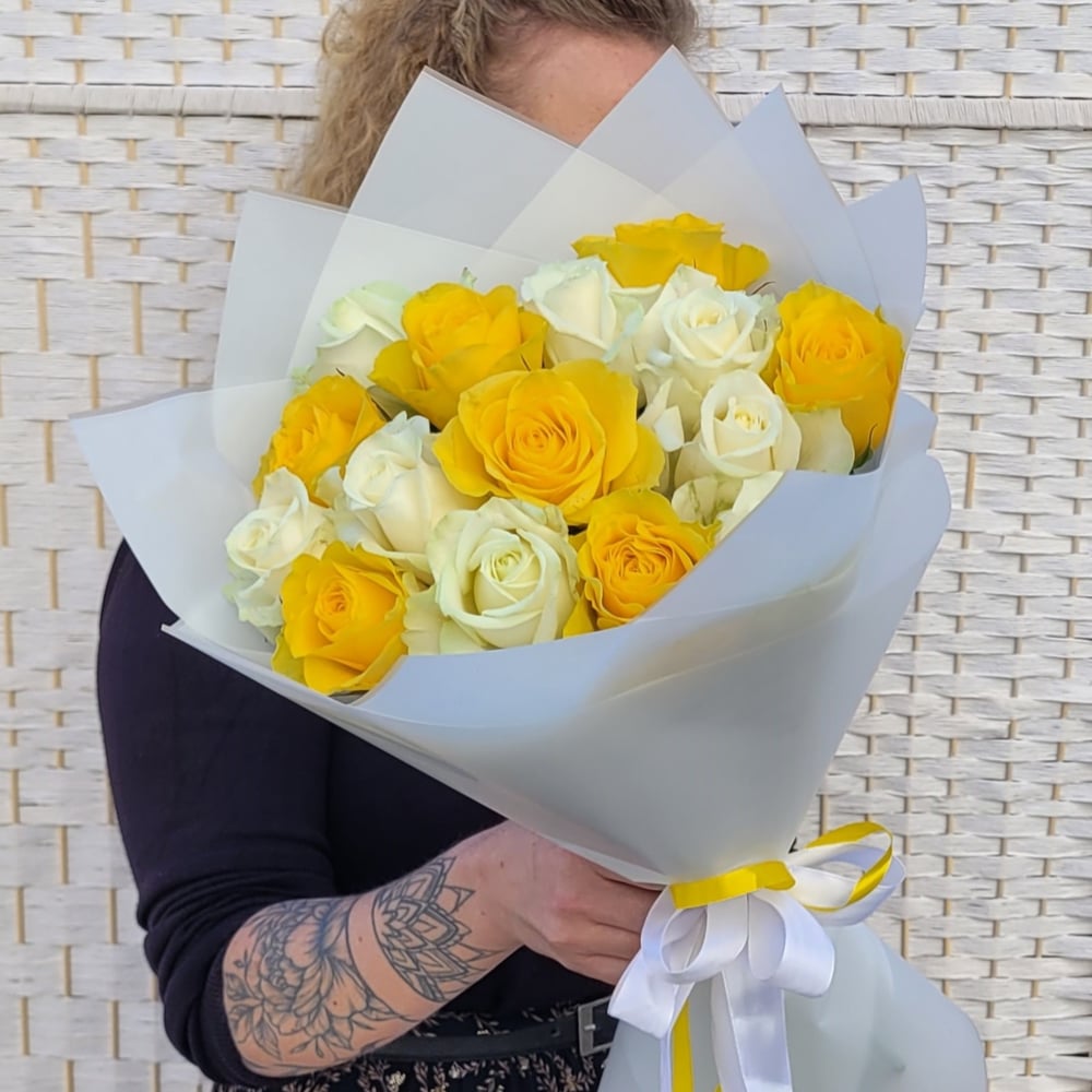 Микс из 15 желтых и белых роз в гармоничной упаковке.