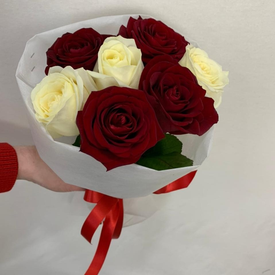 Букет из белых и красных роз подходит милой и скромной девушке, которая занимает все мысли дарителя.