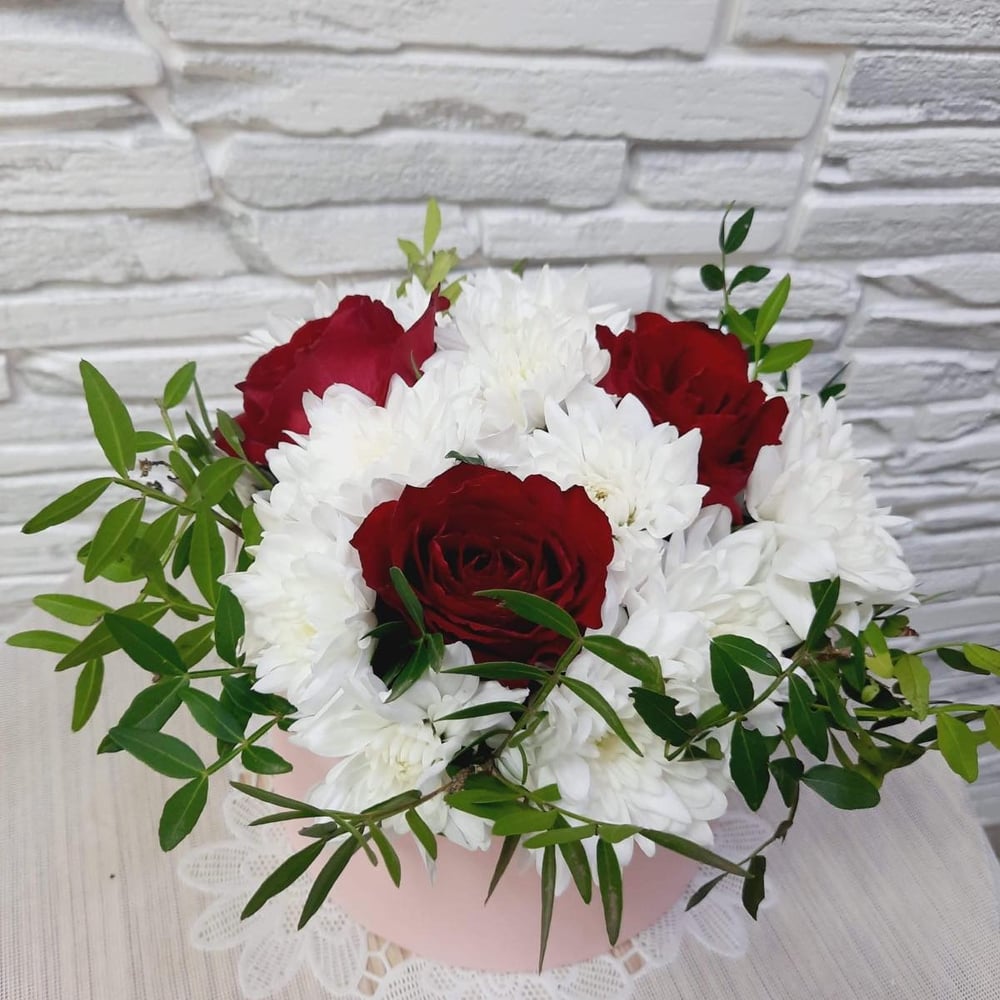 Шляпная коробка с цветами «Безмятежность» из хризантем