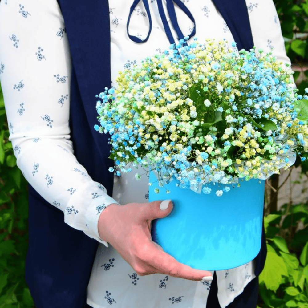 Бирюзовая гипсофилы в шляпной коробке