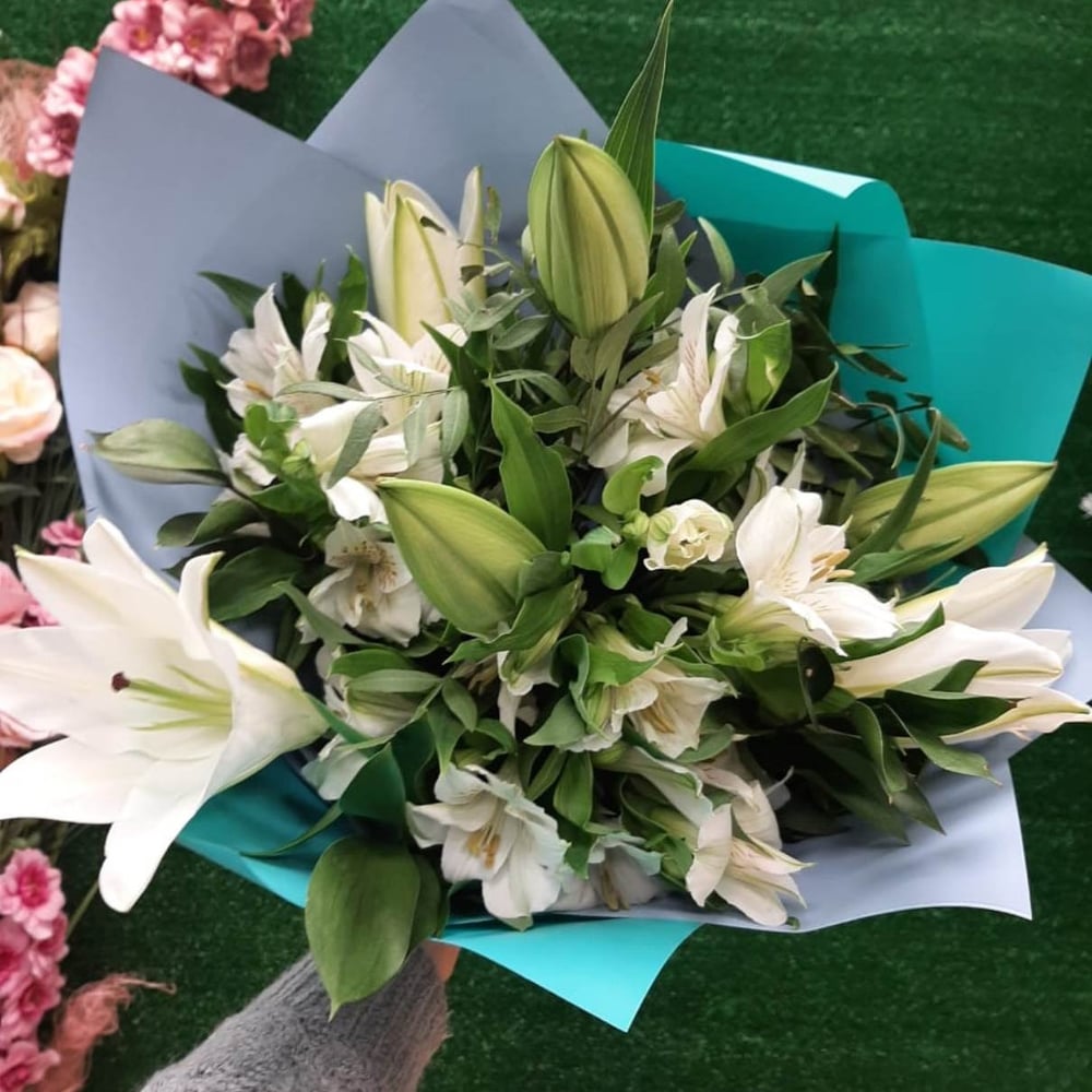 Букет «Бирюзовый снег» из альстромерий и лилий