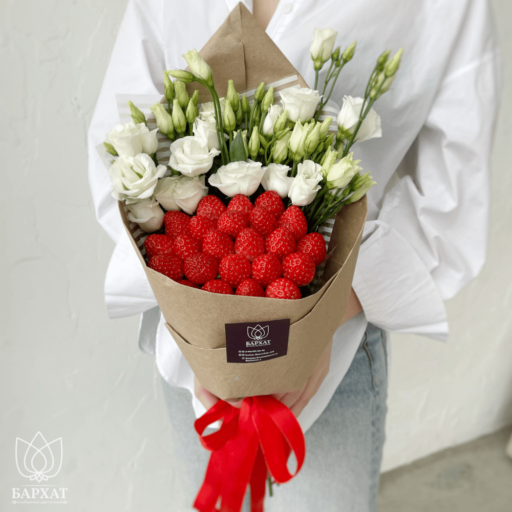 Букет из свежей клубники и живых цветов. Клубника держится на каркасе из шпажек. Упаковка - флористическая пленка, лента, фирменная наклейка. Клубника отделена от цветов прозрачной пленкой. Готовый букет упаковывается в прозрачную слюду, фирменная инструкция по хранению - в подарок. Клубника 220 гр.