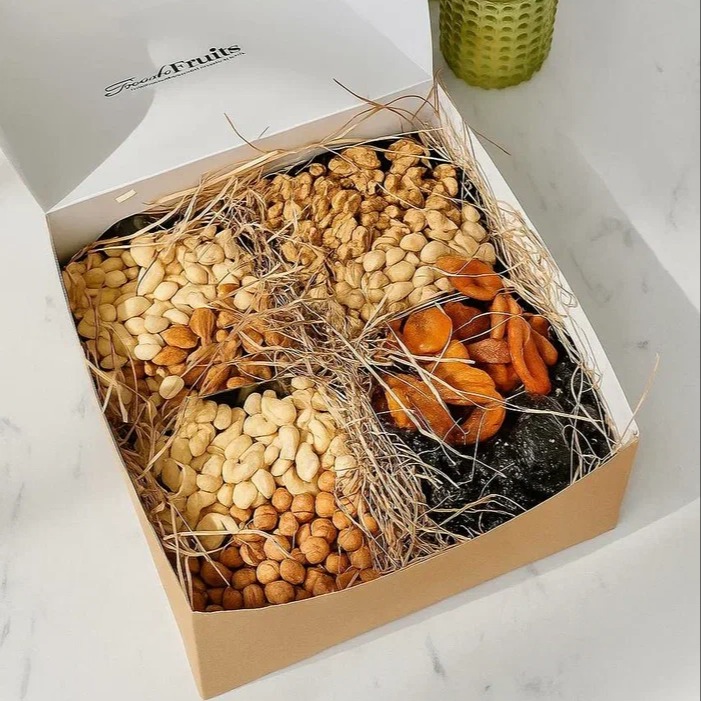 Каждый компонент тщательно подобран для продуктивной работы ума. Создайте свой уникальный набор энергии — заменяйте любые компоненты по вашему вкусу. Идеальный подарок для тех, кто достигает большего! Зарядите мозг правильной энергией! Наш бокс — это идеально сбалансированный микс: по 200 г отборного миндаля, фундука, грецкого ореха, кешью, фисташек, медовой кураги, чернослива и арахиса.