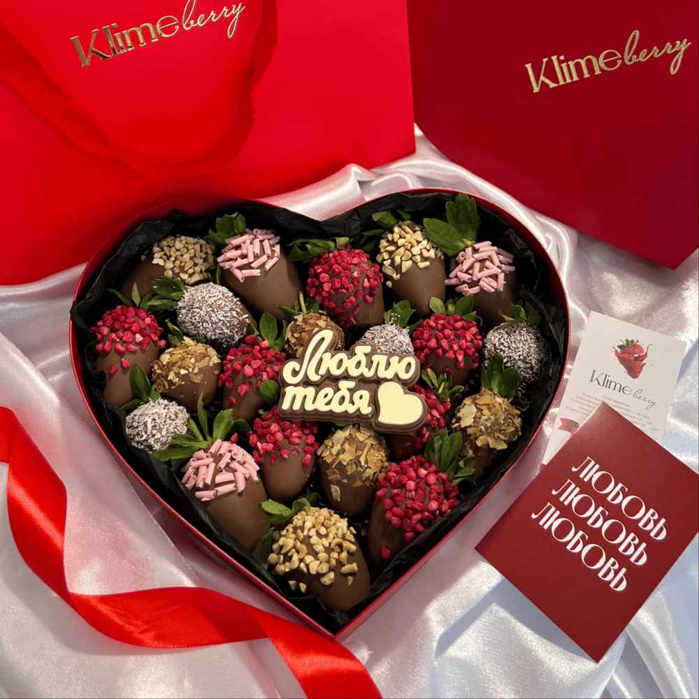 20-25 клубничек в молочном бельгийском шоколаде Callebaut в подарочной упаковке в форме красного сердца — идеальный подарок любимому человеку на 14 февраля ❤️ В стоимость входит табличка из бельгийского шоколада «Люблю тебя», брендированный подарочный пакет, тематическая открытка и праздничное оформление. Срок хранения — 12 часов при комнатной температуре и 24 часа в холодильнике 🍓