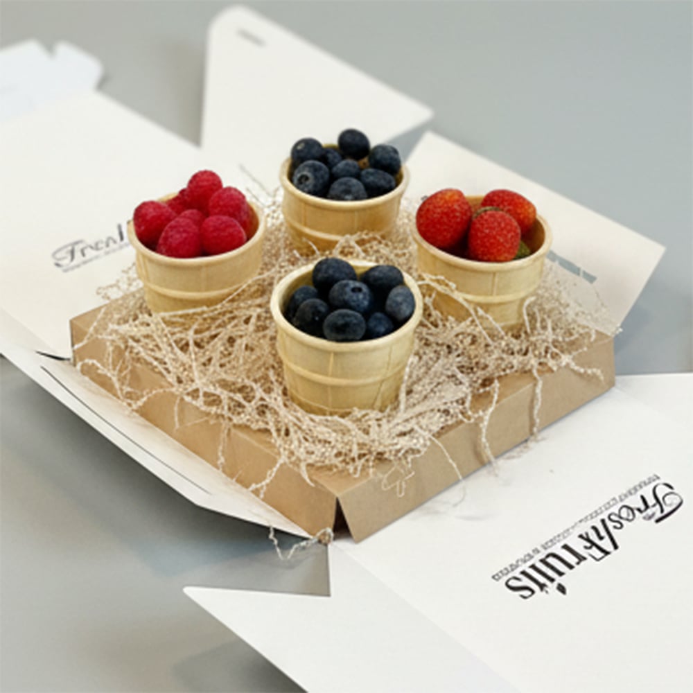 Мы превратили свежие ягоды в изысканный дизайнерский подарок. Наш бокс — это гармония вкуса и эстетики, созданная с вниманием к каждой детали. Четыре вафельных стаканчика, наполненных отборной голубикой, клубникой и малиной, выглядят как мини-шедевры. Сочная клубника в вафельном стакане - 70 гр. Спелая малина в вафельном стакане - 70 гр. Ароматная голубика в вафельном стакане 70 гр - 2 шт.