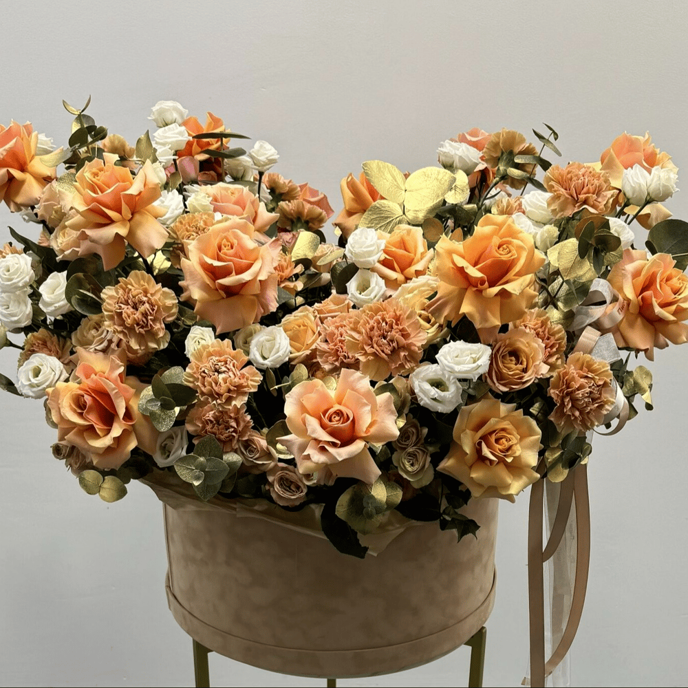 Роскошная композиция "Чайная церемония" – настоящее воплощение нежности и тепла. Крупные оранжево-персиковые розы в сочетании с нежными гвоздиками и декоративными вставками создают яркую и сбалансированную композицию. Эта композиция в бархатной шляпной коробке привнесет солнечные краски в любой день и повысит настроение. Она идеально подойдет в качестве подарка без повода, чтобы порадовать близкого человека, или как комплимент, выражающий восхищение.