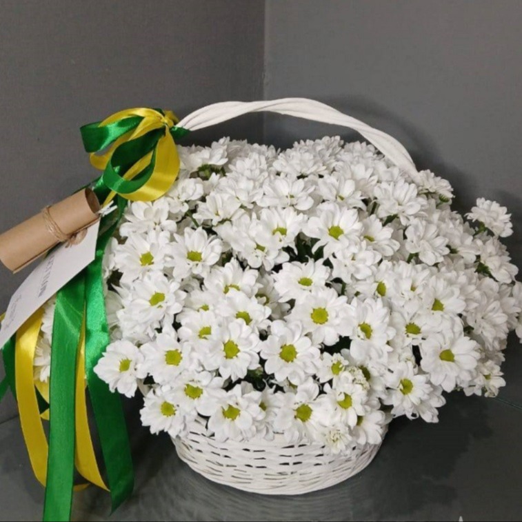 Прекрасный букет из 25 кустовых хризантем, уложенных в корзину и дополненных оазисом для длительного сохранения свежести цветов. Этот букет станет прекрасным подарком для любого случая и порадует своего получателя своей красотой и оригинальностью.