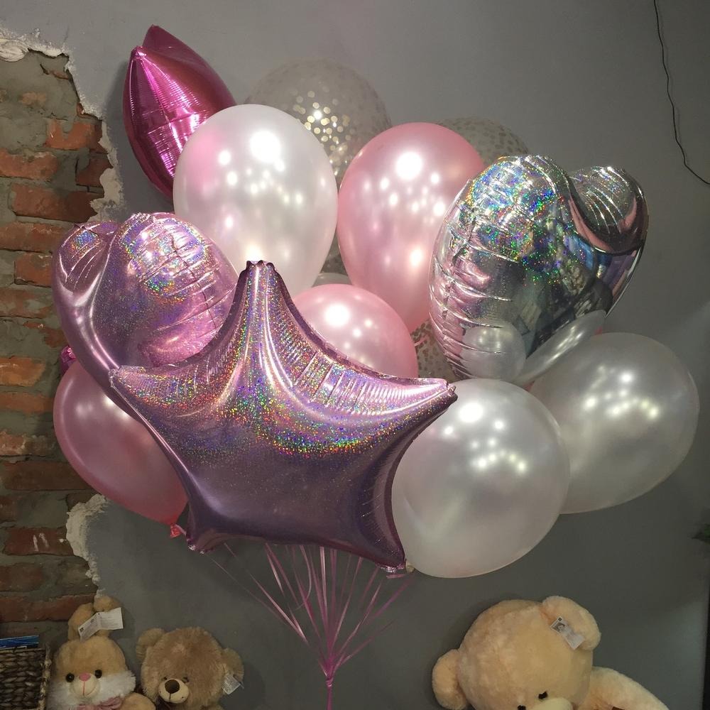 Большая связка фольгированных и латексные шаров. В связке 5 фольгированных и 10 латексных шаров
