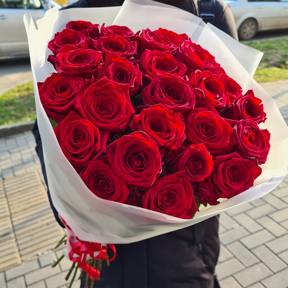 Огромный букет красных роз премиум качества всего из 25 роз!! Роза ред наоми имеет длинный ровный стебель, большой бутон и просто сногсшибательный аромат! Также данная роза отличается высокой степ...