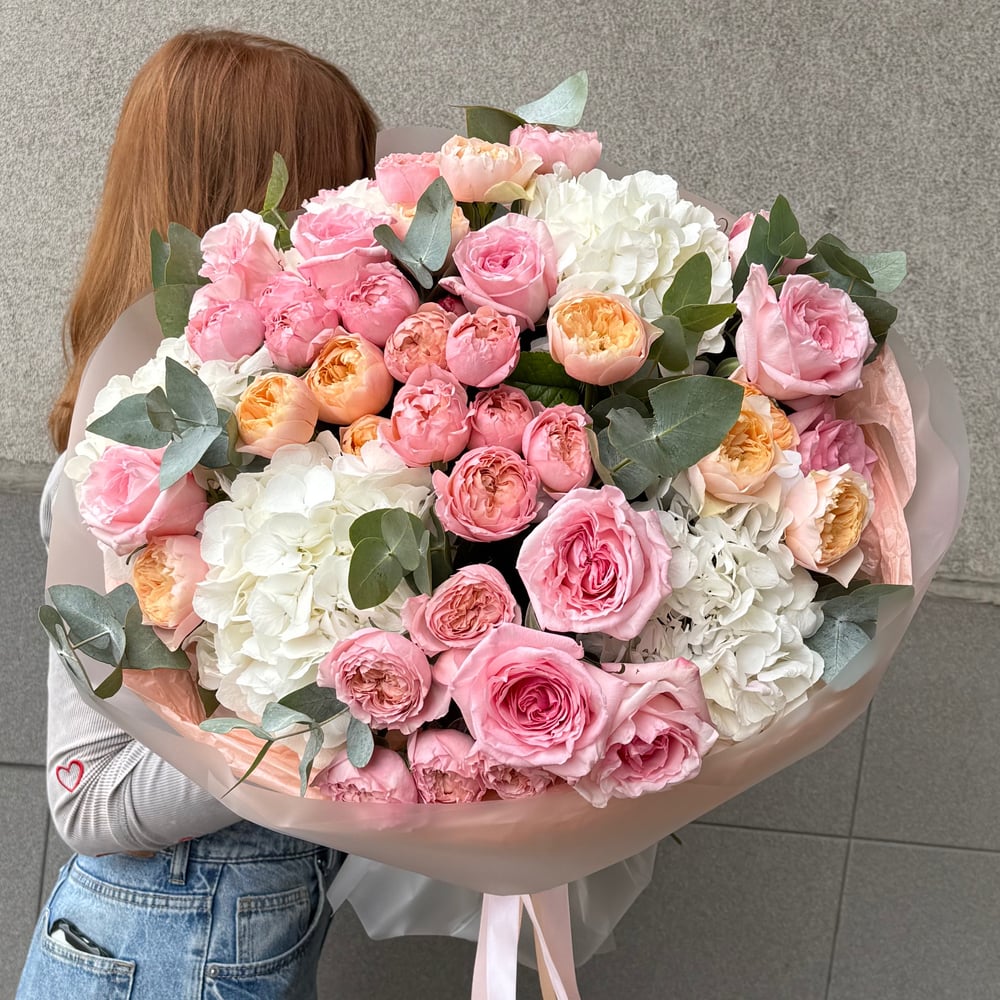 Большой букет с белыми гортензиями и ароматными пионовидными розами