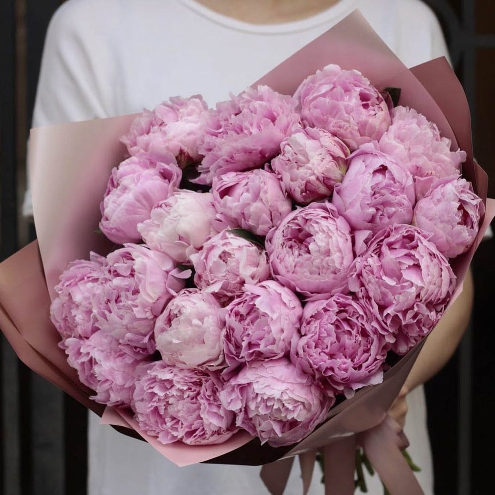 Состав: Пионы Sarah Bernhardt - 23 шт, Матовая пленка розовая углами Размер: Диаметр: 45 см / Высота: 50 см У каждой женщины есть свои фавориты в мире цветов, но сложно найти ту, которая была бы...