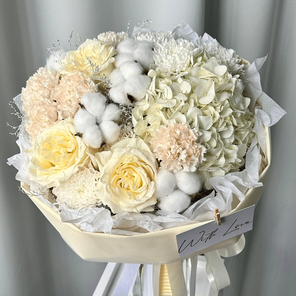 Большой букет с кремовыми розами, гортензией и хризантемой в круглой упаковке