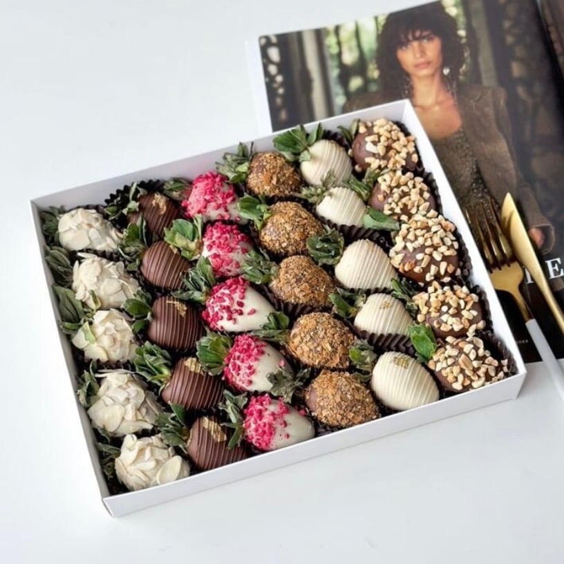 Отборная клубника, вафельная крошка, сублимированная малина, миндальные лепестки, дробленый миндаль,съедобное золото, бельгийский шоколад