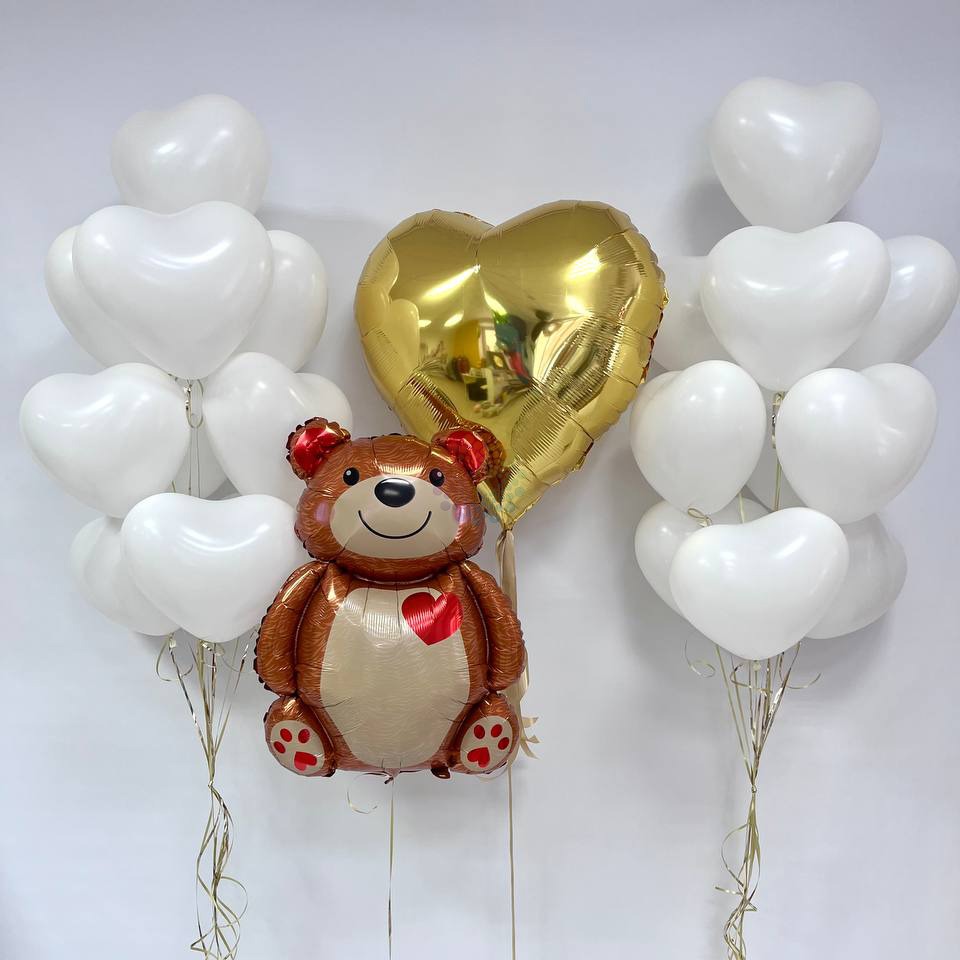 Подарите своей второй половинке незабываемые моменты в день всех влюбленных с нашим эксклюзивным набором воздушных шаров! Этот большой набор станет идеальным украшением для романтического вечера и создаст атмосферу любви и нежности. ▎Состав набора: • Два фонтана латексных сердец (по 9 шт.): В нашем наборе вы найдете два великолепных фонтана из белых латексных шаров в форме сердец, по 9 штук в каждом. Эти воздушные шары символизируют чистоту и искренность чувств, придавая вашему празднику особый шарм. • Золотое сердце (45 см): В дополнение к белым сердцам, мы включили эффектное золотое сердце диаметром 55 см. Этот яркий элемент добавит нотку роскоши и элегантности в ваш декор, подчеркивая важность момента. • Фигура мишка с сердцем (91 см): Завершает наш набор очаровательный мишка с сердцем высотой 91 см. Этот милый персонаж станет центром внимания и вызовет улыбки у всех присутствующих, добавляя теплоту и радость в ваш праздник. Не упустите шанс сделать этот 14 февраля незабываемым! Закажите наш большой набор воздушных шаров с мишкой и сердцами и подарите своей любимой/любимому радость и улыбки. Пусть ваша любовь засияет ярче с нашими удивительными воздушными шарами!
