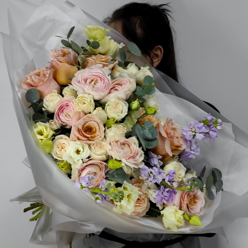 Состав: Роза Shimmer - 7 шт, Ранункулюс - 5 шт, Эустома White - 4 шт, Роза кустовая Miss Bombastic - 6 шт, Маттиола - 3 шт, Фисташка - 4 шт, Эвкалипт - 3 шт, Тишью белая, Матовая пленка белая прозр...