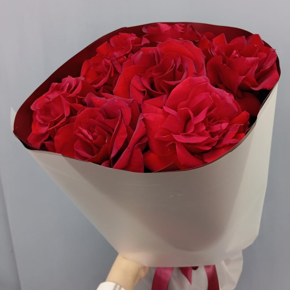 Букет из 7 красных французских роз бордо, оформленных в дизайнерскую упаковку.