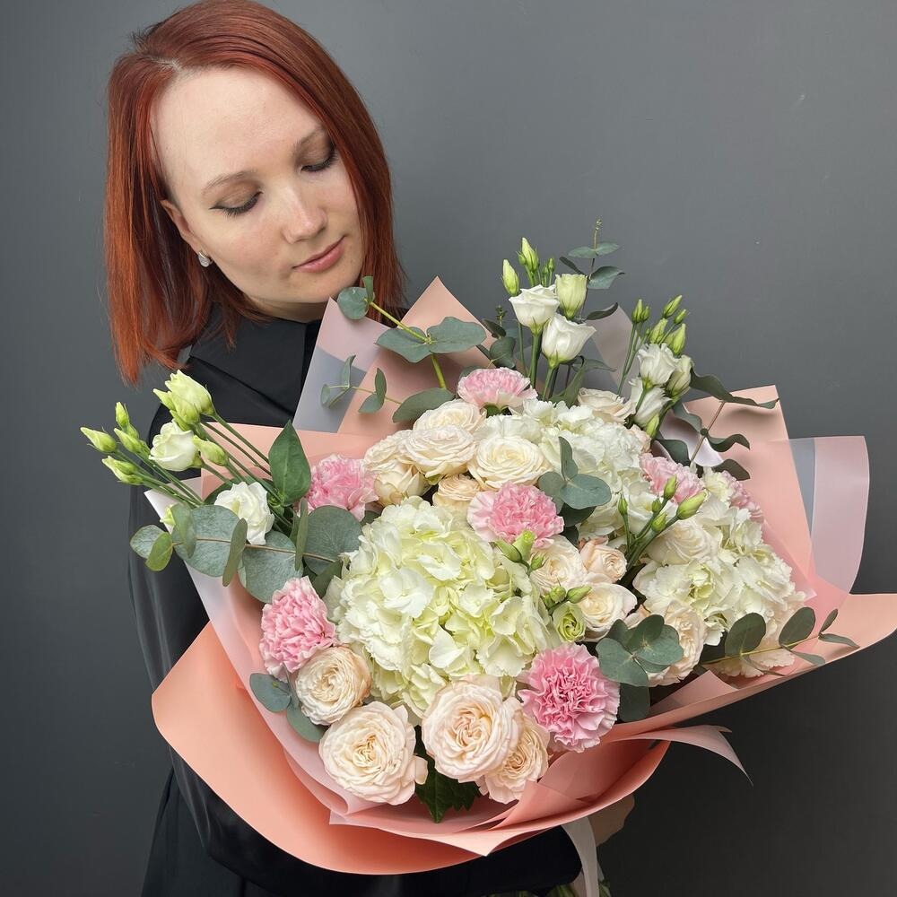 Изящный микс-букет гортензии, эустомы и гвоздики 🌸 Восхитительная флористическая композиция, объединяющая очарование гортензии, эустомы и гвоздики и символизирующая элегантность, грацию и восхищение…