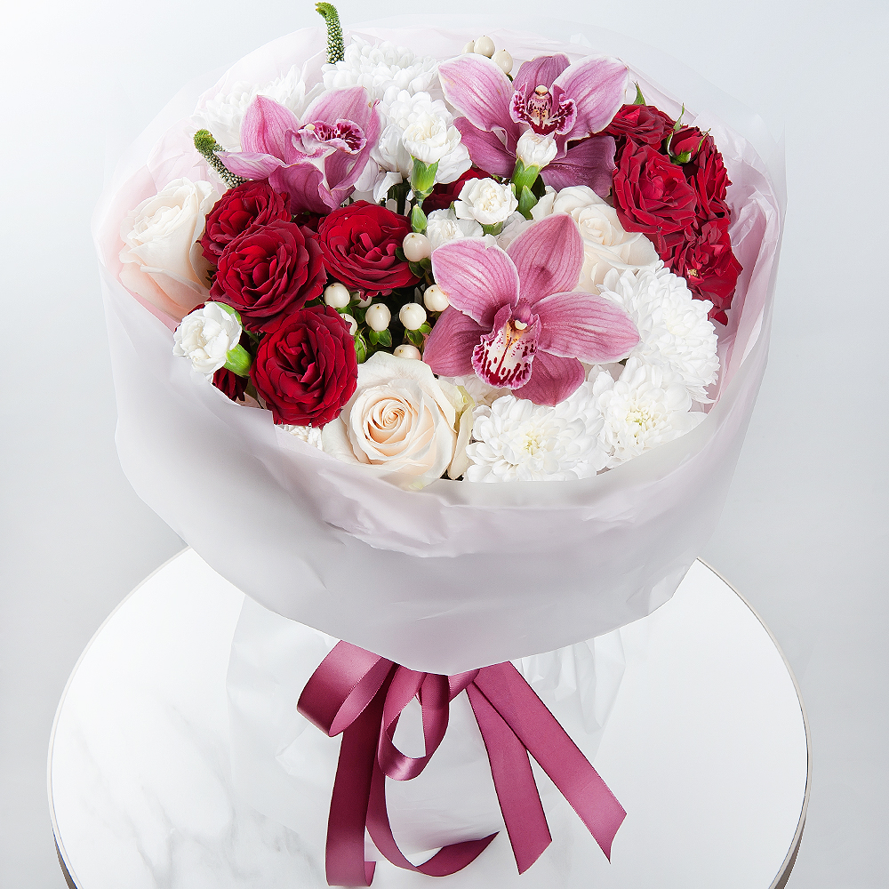 Букет сочетает в себе разнообразие цветов, символизирующих любовь и привязанность. Гвоздики, белые розы, хризантемы и орхидеи, обрамленные гиперикумом и вероникой создают удивительную композицию. С...