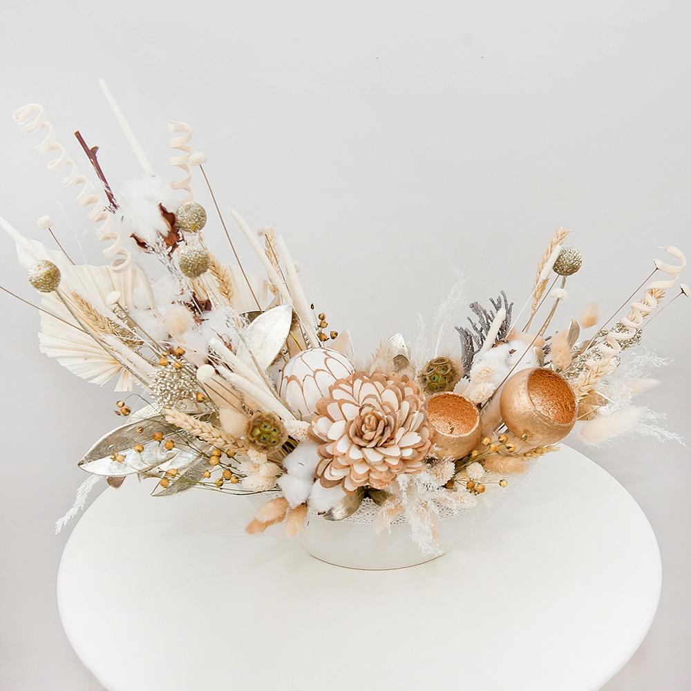 Эта композиция сияет, как самый восхитительный восход. Краспедия, бруния и сухоцветы создают уникальное сочетание с декоративными элементами и хлопковыми бутонами. Керамическое кашпо придает композиции изысканный и стильный вид, что делает ее украшением любого интерьера.