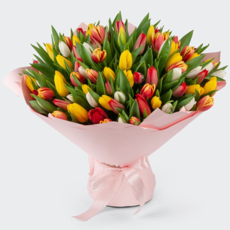 Букет из 101 разноцветного тюльпана - прекрасный подарок для любимых, пышный и привлекательный, красочный и радостный. Самые весенние из цветов принесут вместе с собой любовь и тепло, хорошее настроение и ощущение свежего ласкового ветерка!