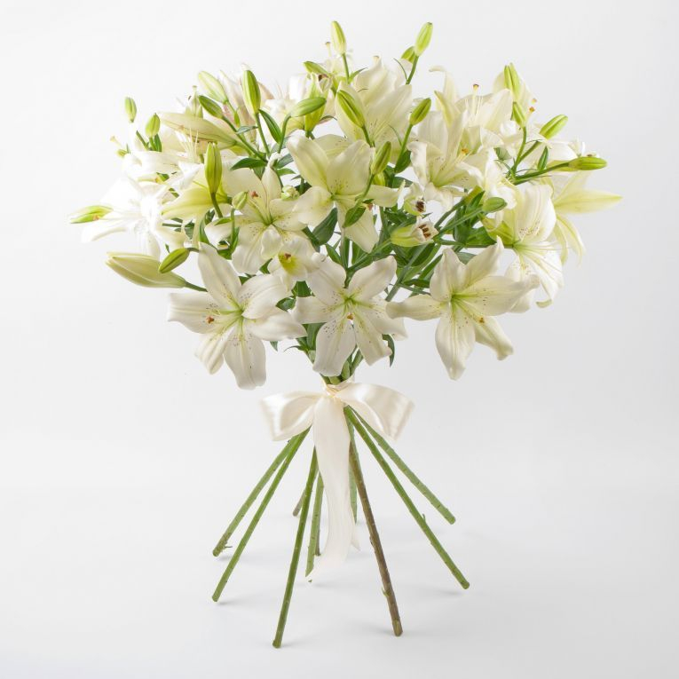 Монобукет из классических белых лилий подкупает изысканностью и элегантностью. Крупные бутоны с терпким, ничем не сравнимым ароматом помогут поздравить с праздником, поднять настроение или украсят собой любой день.