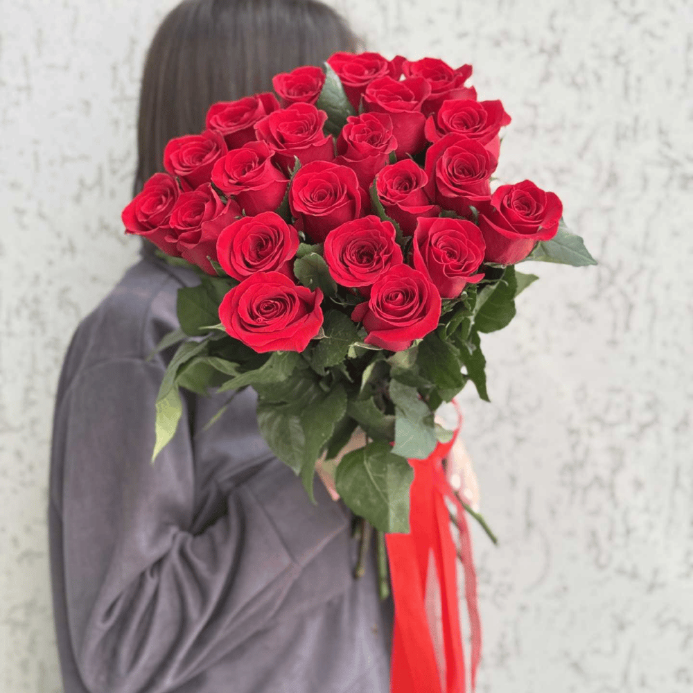 Букет 21 красная роза в ленте