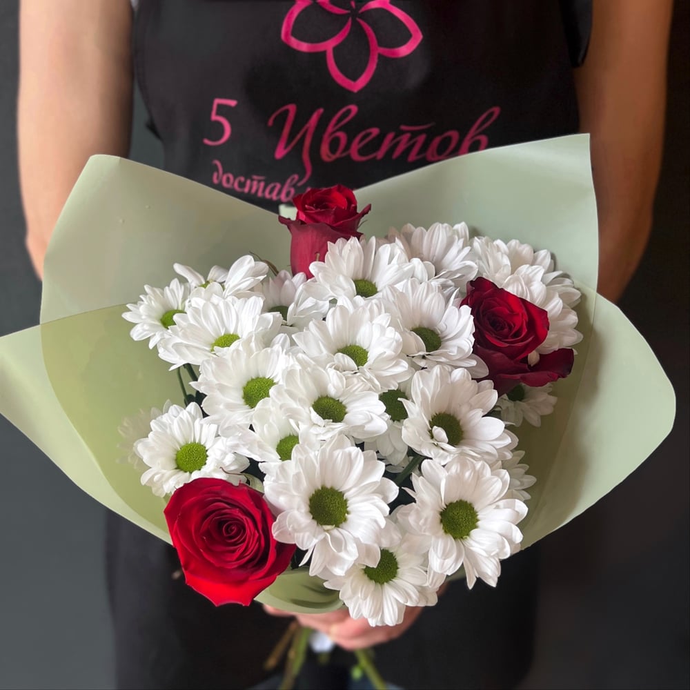 Букет живых цветов - это сочетание красоты и свежести, которое способно подарить радость и теплоту.Букет состоит из 3 красных роз и 3 хризантем. Эти цветы символизируют любовь, страсть и уважение, чт…