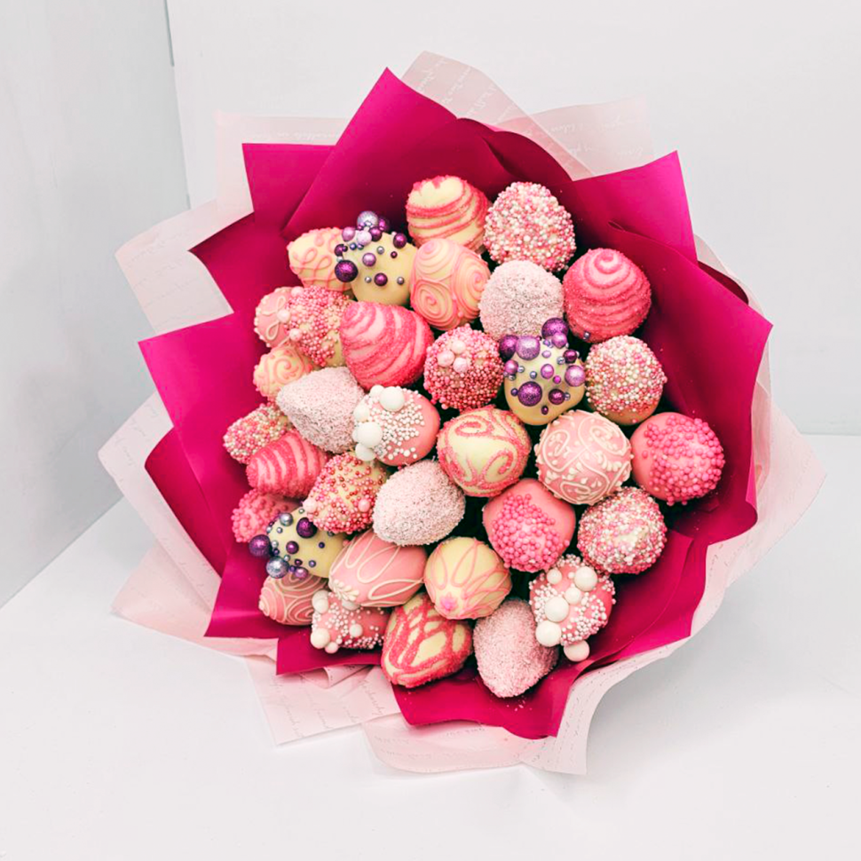 Букет из 33 ягод, покрытых бельгийским шоколадом, — это изысканный сладкий подарок ручной работы, который станет настоящим украшением любого торжества или приятным знаком внимания без повода. Сочетание свежей клубники и шоколада создает незабываемый вкус, который порадует даже самых требовательных гурманов. Каждый букет уникален благодаря использованию сладкой посыпки и узоров ручной работы, а также кокосовой стружки, что придает ему особую привлекательность. Эта шоколадная ягодная композиция выполнена с любовью и вниманием к деталям, а ее оформление включает деревянные шампура, бант из атласной ленты и цветную пленку, что делает его идеальным подарком для жены, любимой, мамы или коллеги.