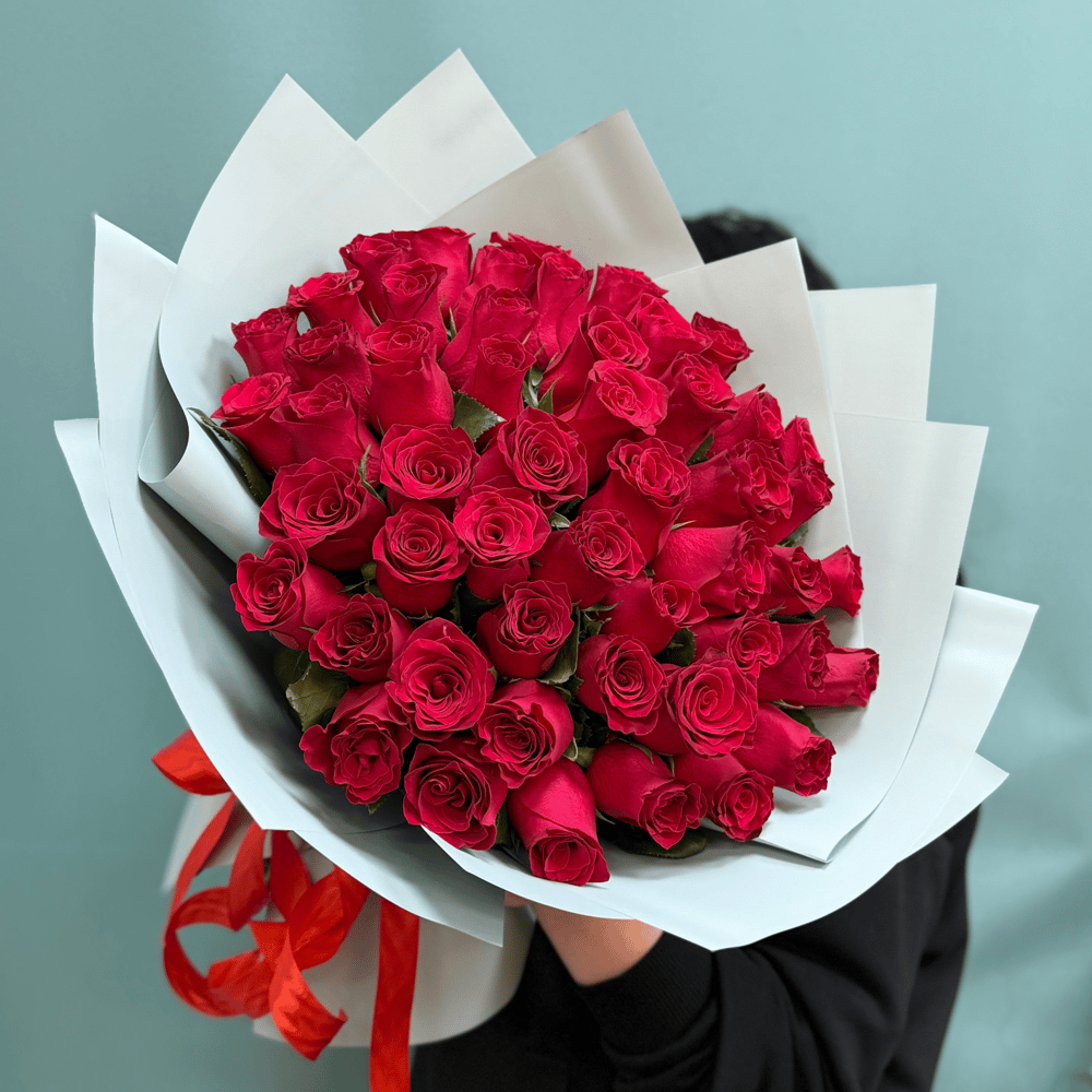 Букет 51 красная роза в оформлении