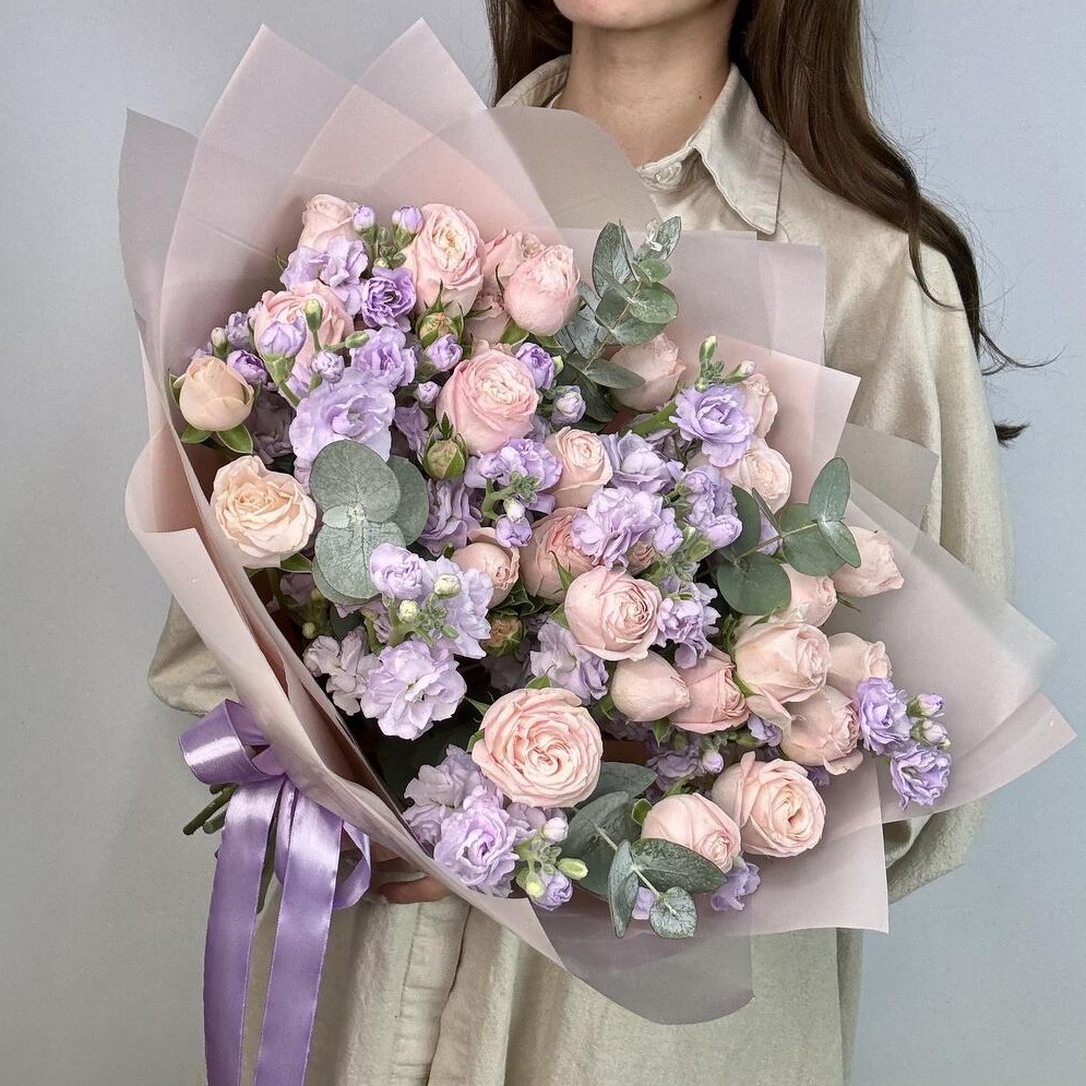 Этот утонченный букет выглядит изысканно и очаровательно благодаря сочетанию нежных маттиол, пышных роз пионовидной кустовой и ароматного эвкалипта. Упакован в стильную дизайнерскую пленку, он станет прекрасным подарком для любого повода