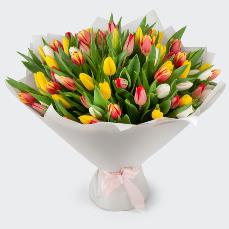 Букет из 75 тюльпанов разных цветов наполнен оптимизмом. Замечательный подарок для любой женщины, полный нежности, любви и сердечного тепла!