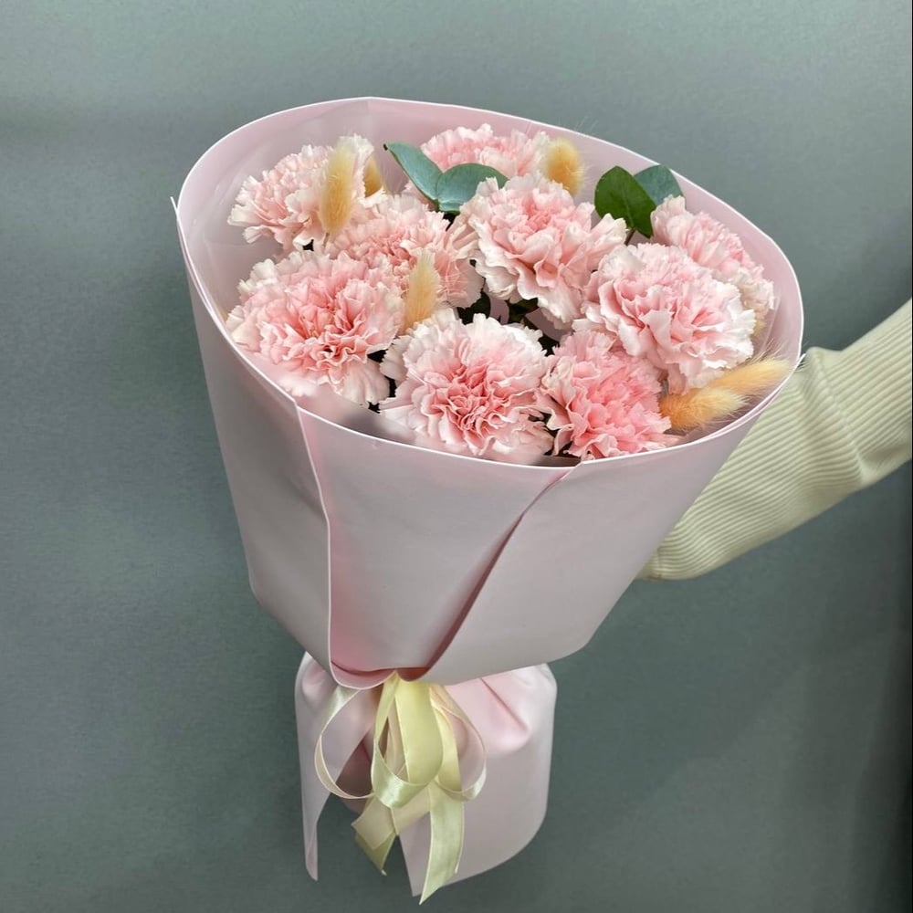 Букет «Нежное прикосновение» — это воплощение утончённости и романтики. Он состоит из розовых гвоздик, которые символизируют тепло и заботу, и украшен веточками эвкалипта, добавляющими свежести и ...