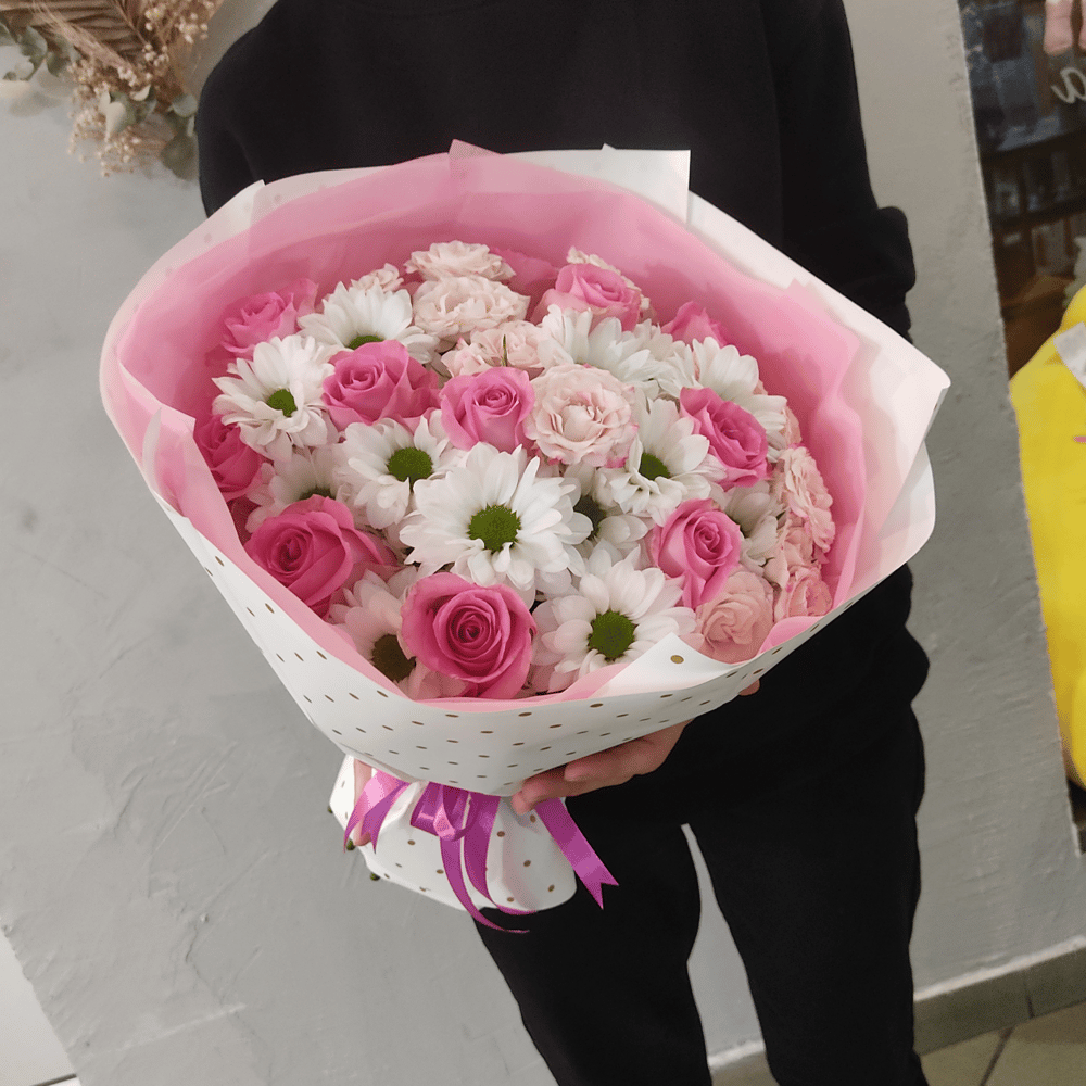 Букет бело розовый с хризантемой