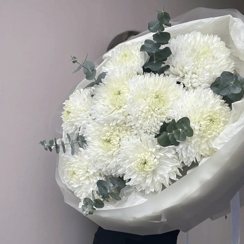 Этот утончённый букет сочетает в себе крупные, выразительные хризантемы магнум и свежие ветви эвкалипта, создавая гармоничный и современный образ. Всё цветочное великолепие аккуратно укрыто в стиль...