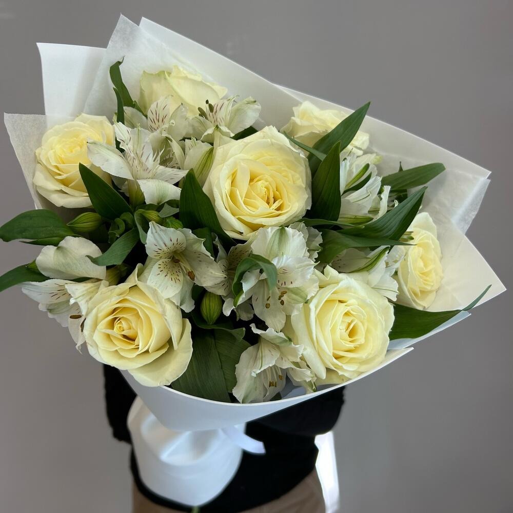 Классический букет из роз и альстромерии в модном оформлении! Такой букет можно подарить на любое торжество!