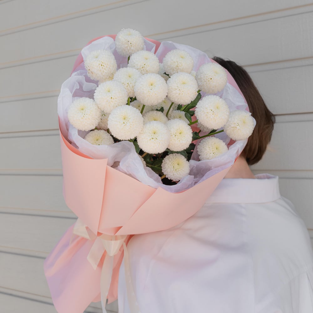 Монобукет Blanc de Mont Blanc S (белый цвет Монблана) — это не просто букет, это воплощение чистоты и величия, вдохновленное снежными вершинами Монблана. Белые кустовые хризантемы, напоминающие шар...