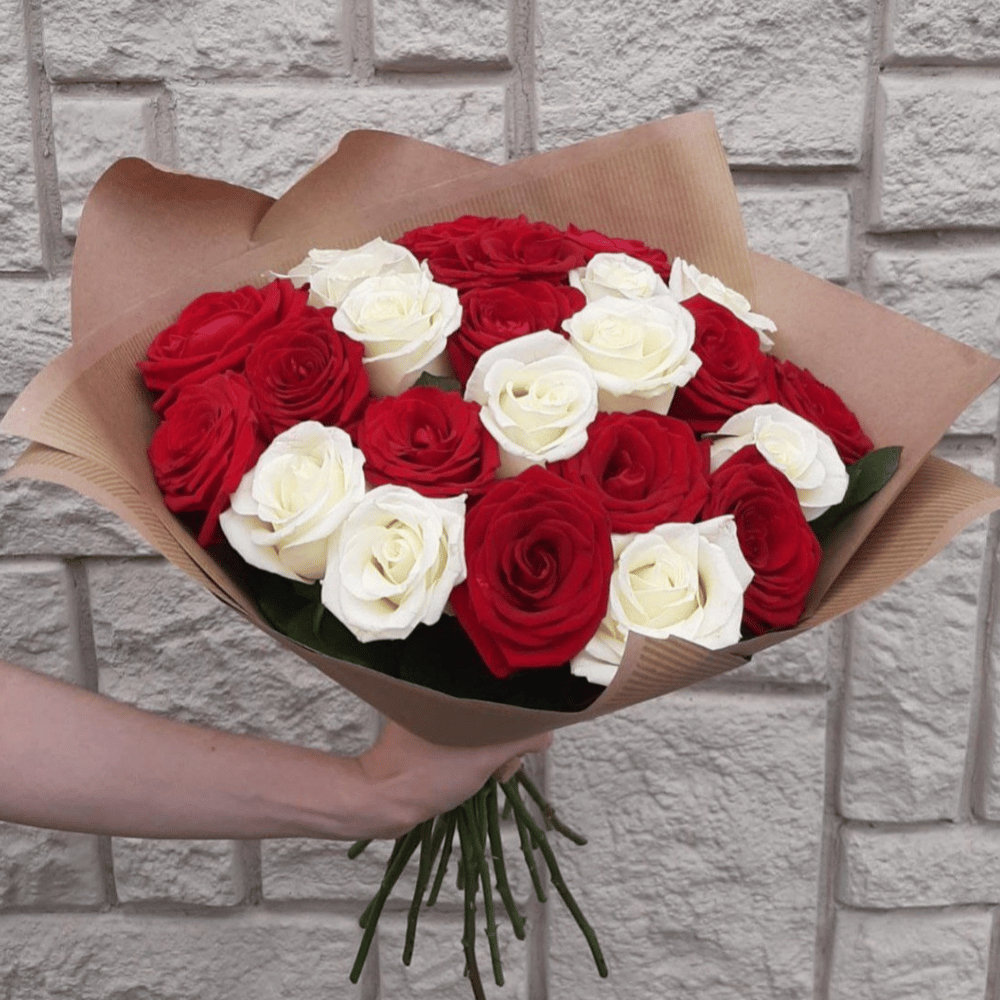 Символичный букет из белых и красных роз - символ Вашей взаимной любви !