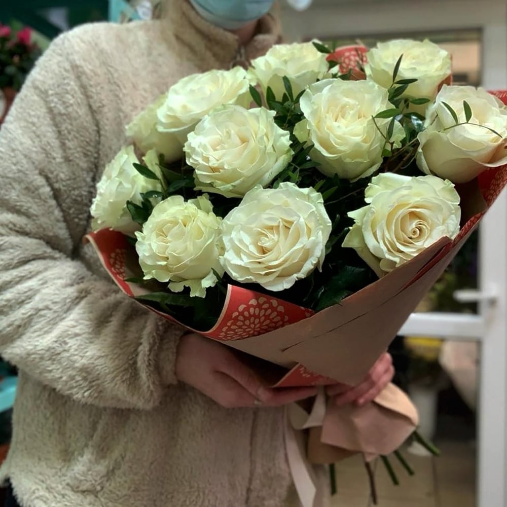 Букет из 11 белых роз в крафте, зафиксирован атласной лентой. Станет прекрасным подарком для любого повода. По вашему желанию можем упаковать в матовую или прозрачную пленку.