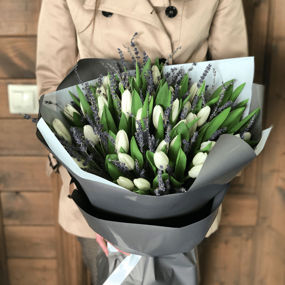 Букет белых тюльпанов и лаванды