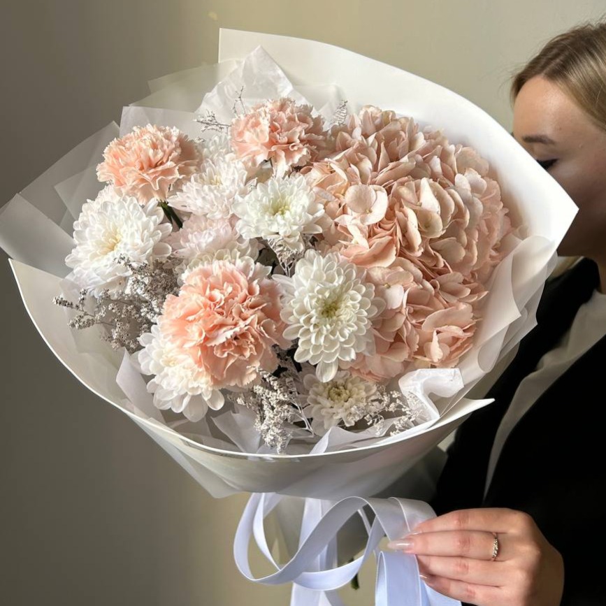 Нежный букет с гортензией, хризантемой, диантусами и сухоцветами