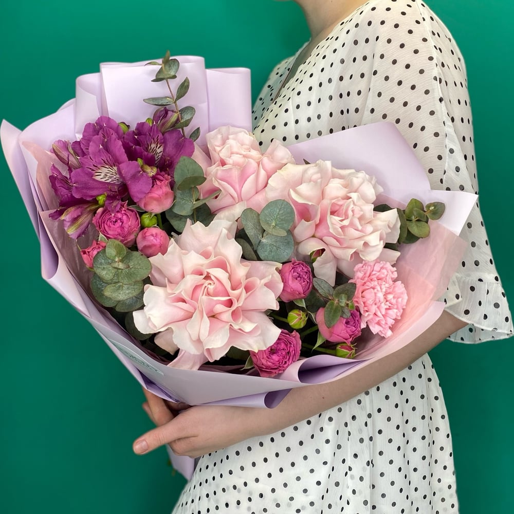букет с французской розой, альстромерией, пионовидной розой