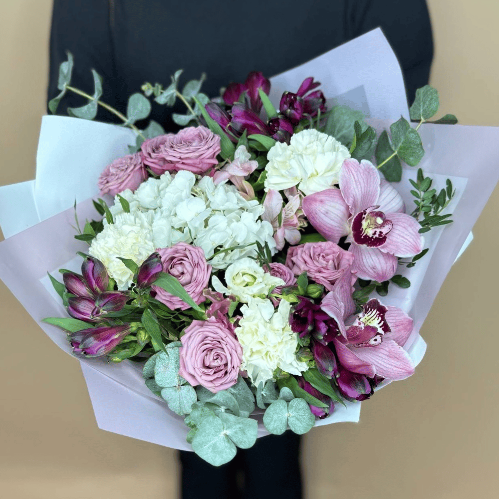 Букет Черничный смузи из роз и альстромерий