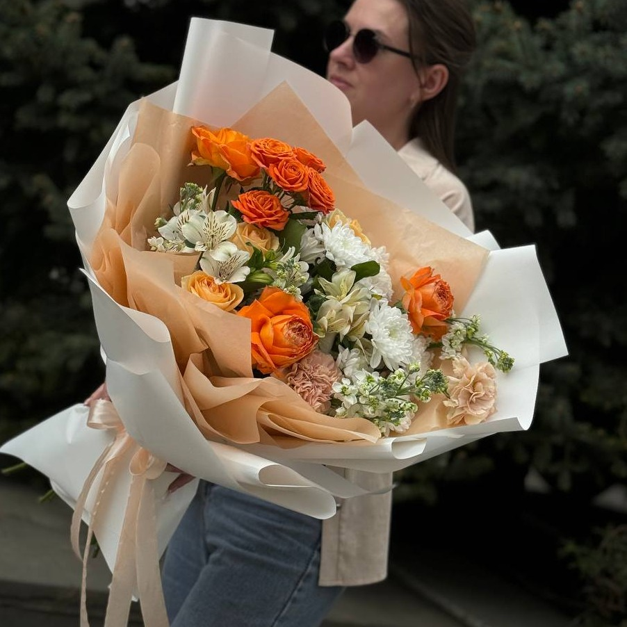 Этот утонченный букет станет прекрасным подарком для любого случая. В его составе розы, маттиола, альстромерия, хризантемы кустовые, гвоздики и розы кустовые. Этот нежный и красочный состав создает атмосферу уюта и тепла. Букет упакован в стильную дизайнерскую пленку, что делает его еще более привлекательным и изысканным.
