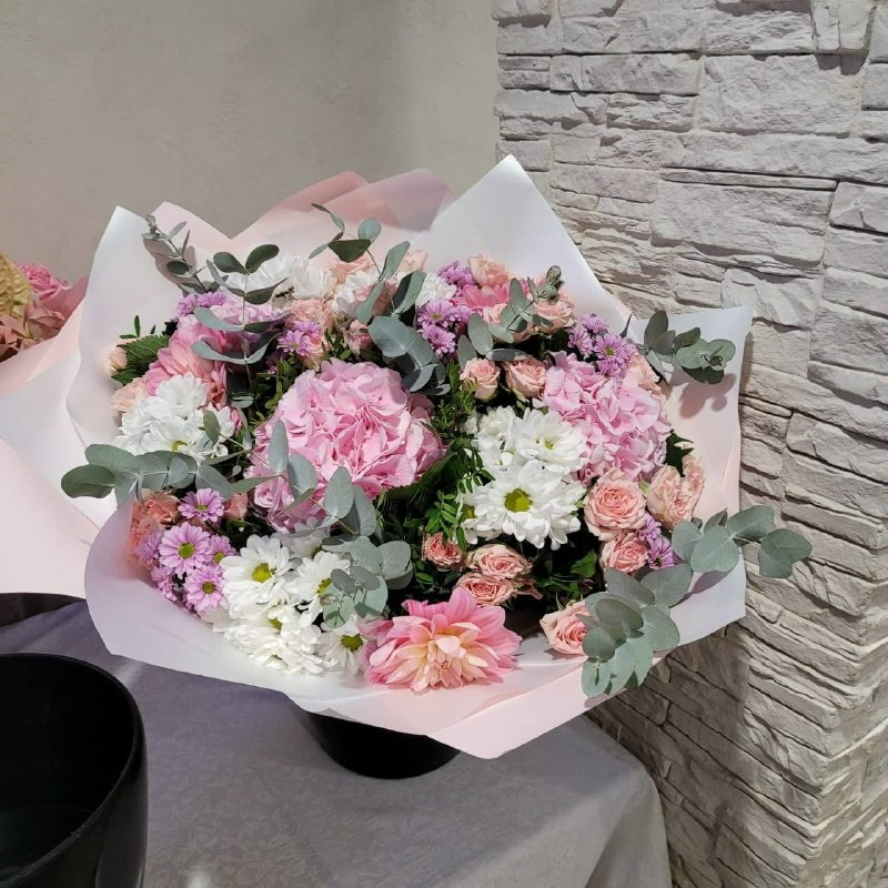 Букет из гортензий, кустовых хризантем, кустовых роз, георгин, эккалипта и писташ.