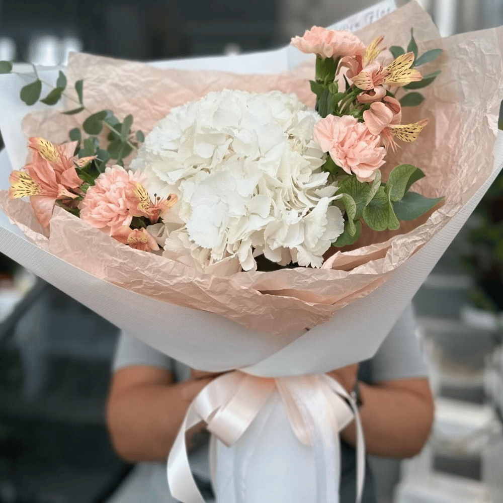 Потрясающий букет из белой гортензии и альстромерии удивит самых избалованных…