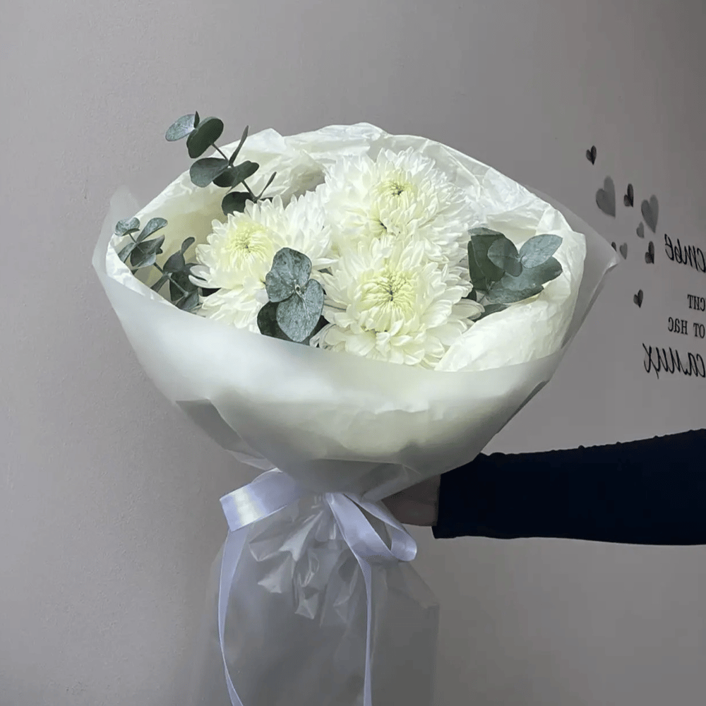 Изящный букет из трёх крупных хризантем Магнум и эффектных ветвей эвкалипта, аккуратно оформленный в современную матовую упаковку. Нежная тишь в составе придает композиции особую спокойную гармонию и элегантность. Идеальное решение для подарка или стильного украшения интерьера, подчеркивающего утончённый вкус.